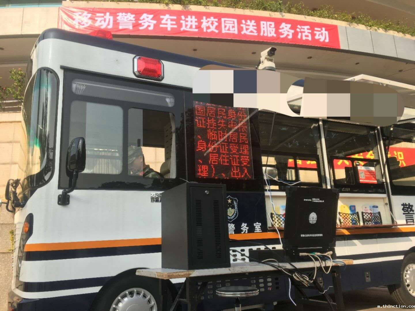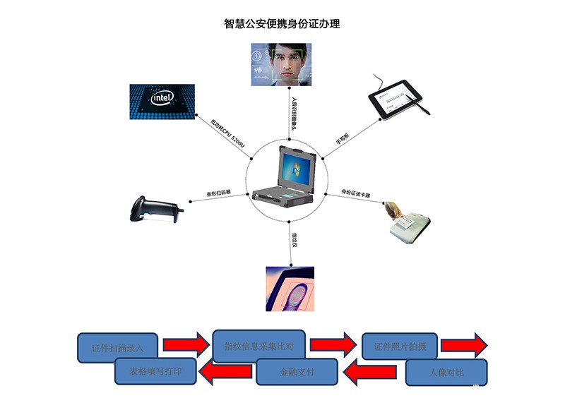 公安民警通过搭载便携式自助办证设备的移动警务车停靠到人流大的临时服务点。作为自助办证设备中核心主机模块的便携式触摸一体机,它内嵌有扫码器、摄像头、指纹仪等外接设备。高度集成的各硬件和系统软件的工作下实现证件扫描录入、指纹信息采集对比、证件照片拍摄、人像对比、金融支付、表格填写打印等政务办理的常用功能,完成全程自助身份证业务办理服务。