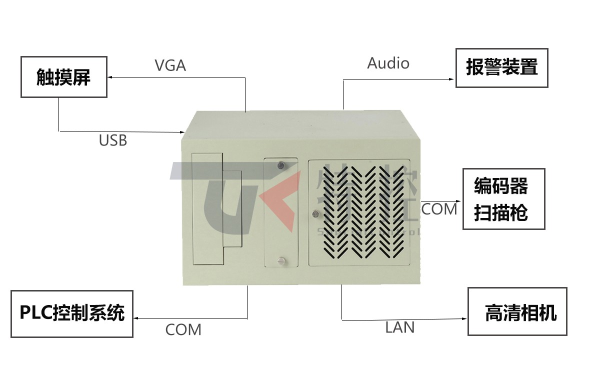 视觉系统包含镜头、CCD照相机、图像处理单元(或图像采集卡)、图像处理软件、监视器、通讯/输入输出单元等。工控机连接USB、触摸屏;PLC、编码器、扫描枪等串口设备;并可搭载至少500W以上高清工业相机(数量可多个),同时内嵌自行开发的图像处理软件,实现自动视觉检测系统功能。工控机安放于检测设备柜内, 通过主板自带的两个千兆网口,及PCIE槽/PCI槽在扩出两个网口,针对检测系统要求高低的不同需要,通过CCD或视频采集卡获得客户应用所需要的图像效果,并通过工控机进行分析与处理。在此过程中可做到对目标物进行自动拍摄记录存储,传输等,可大大提高生产自动化智能化进程和效率。