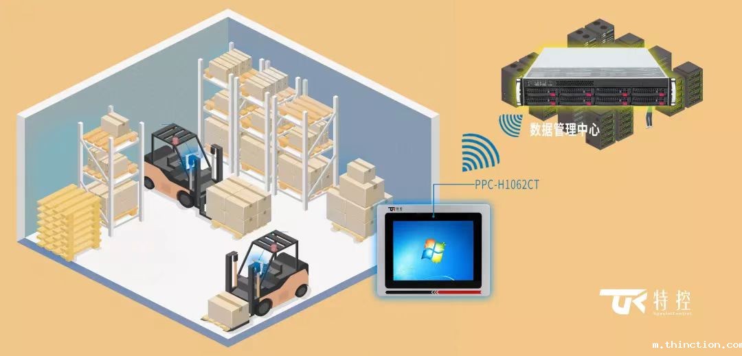 在仓储叉车上应用时,PPC-HW1062CT工业平板电脑上的WiFi接口可与后台中心建立实时沟通和数据交互,这样做的好处有:及时更新货品数据、方便快速的找到货物并且运送到准确位置、极大缩短了找货时间、提高工作效率、降低工作成本、提高物料输送的准确性。