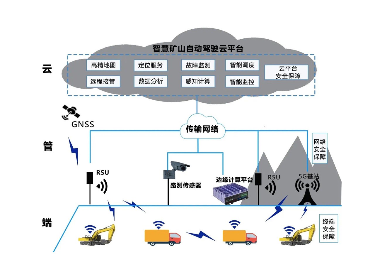 无人驾驶矿卡作业场景通过在重型矿用卡车加装激光雷达、毫米波雷达、高清摄像头、差分GPS定位、车载计算平台等数据采集终端和车辆控制终端,辅以北斗/GPS高精定位系统,通过车与车、车与调度中心间5G实时通讯,基于矿区三维建模数据、实时路测数据、边缘计算能力和无人驾驶调度系统算法,实现重型矿车的路径规划、精准停靠、自动装卸、停车避让、远程操控等作业任务。