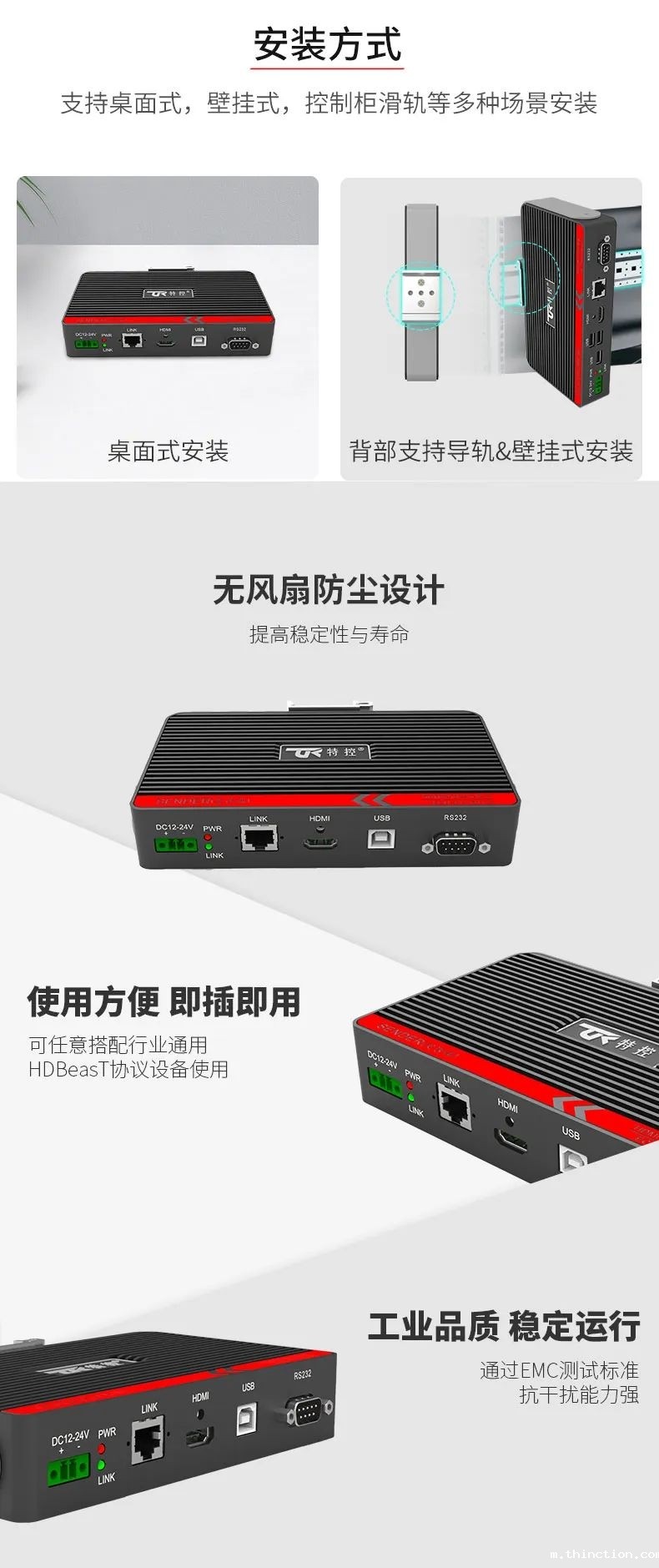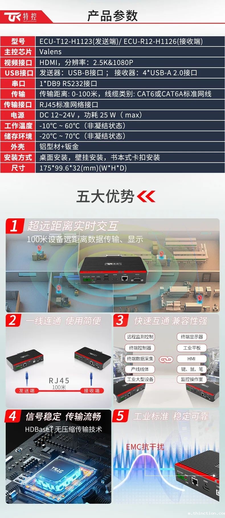 kaiyun体育官方网站官网ECU-TR12采用进口高性能芯片设计,总体由发射端T12和接收端R12两部分组成,发射端可将2.5k高清视频信号、USB和RS232数据信号进行整合,通过标准网线(CAT6)远距离传输到接收端,无信号衰减,接收端通过高性能智能芯片解码,可以给用户高速高质量的数据及显示交互体验,整机外壳采用铝合金散热设计,机身坚固小巧独具工业美感,可搭配行业通用HDBeasT协议设备使用,包括内置协议的HMI操作端、工业显示平板、工业PC及终端采集设备。